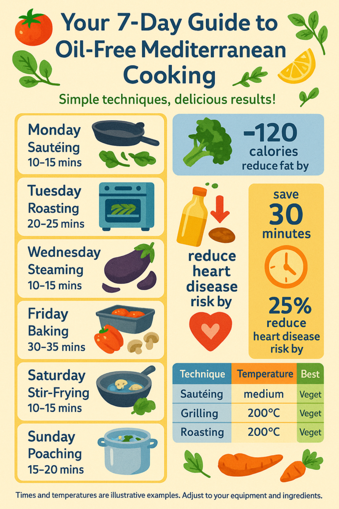 Here’s a simple 7-day plan I’ve developed to help you master oil-free Mediterranean cooking. Think of it like a little experiment – each day focuses on one technique, building your confidence bit by bit.